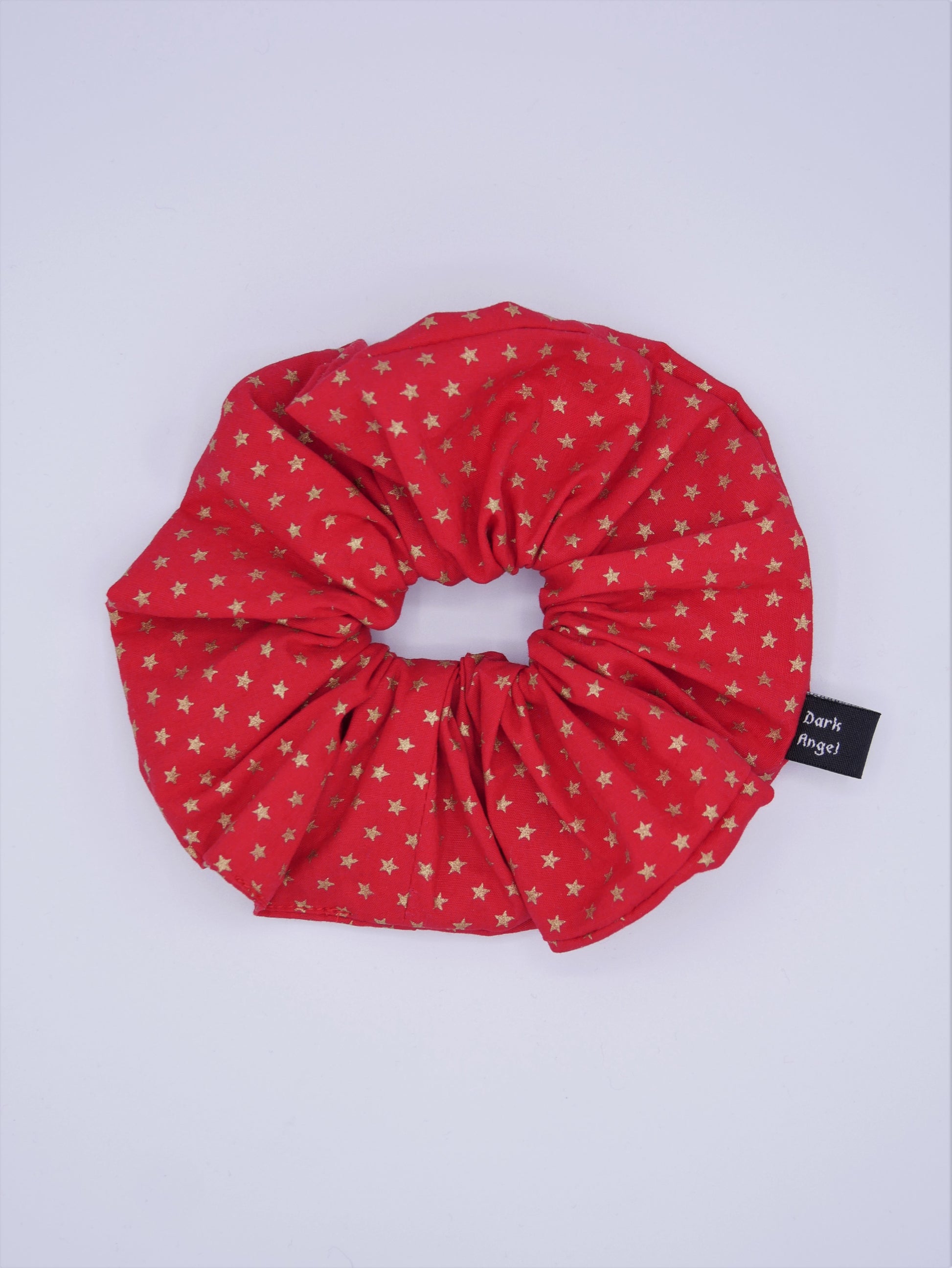 A cotton scrunchie that consists of a star pattern in red and gold. This size is suitable for both thin and thick hair, the diameter is about 13 cm and it fits 2 to 3 times around the hair.