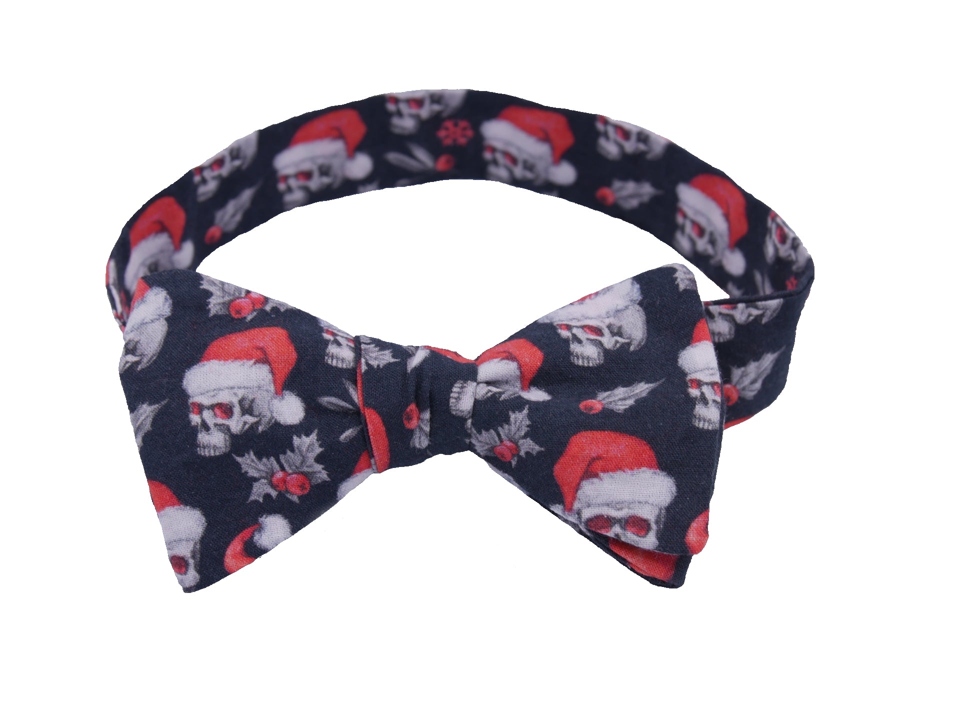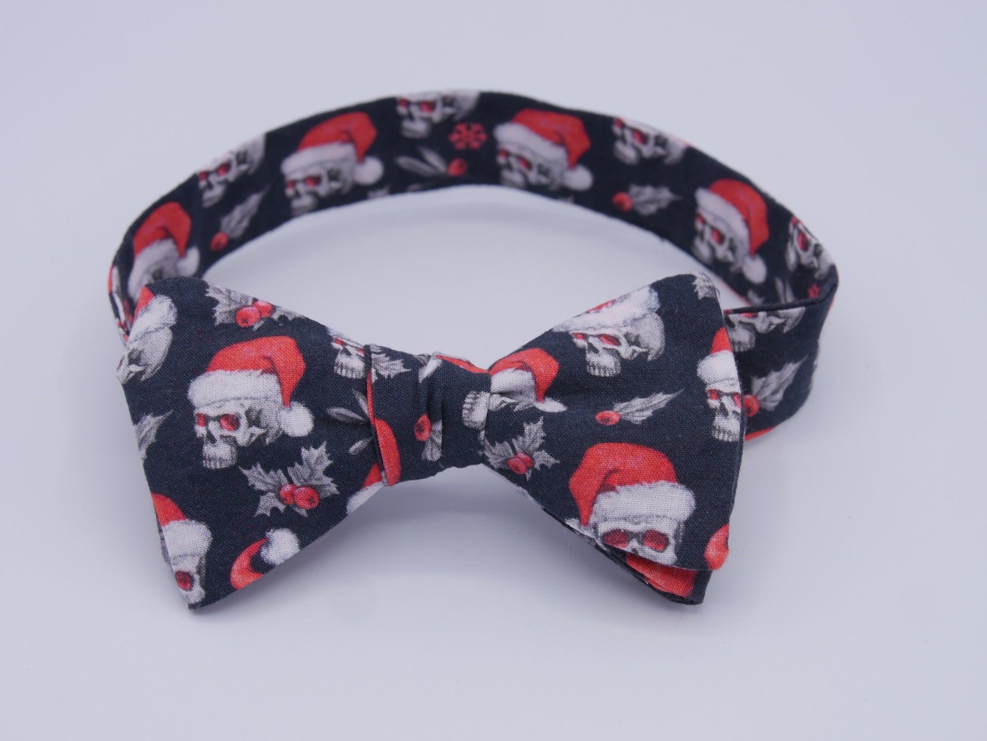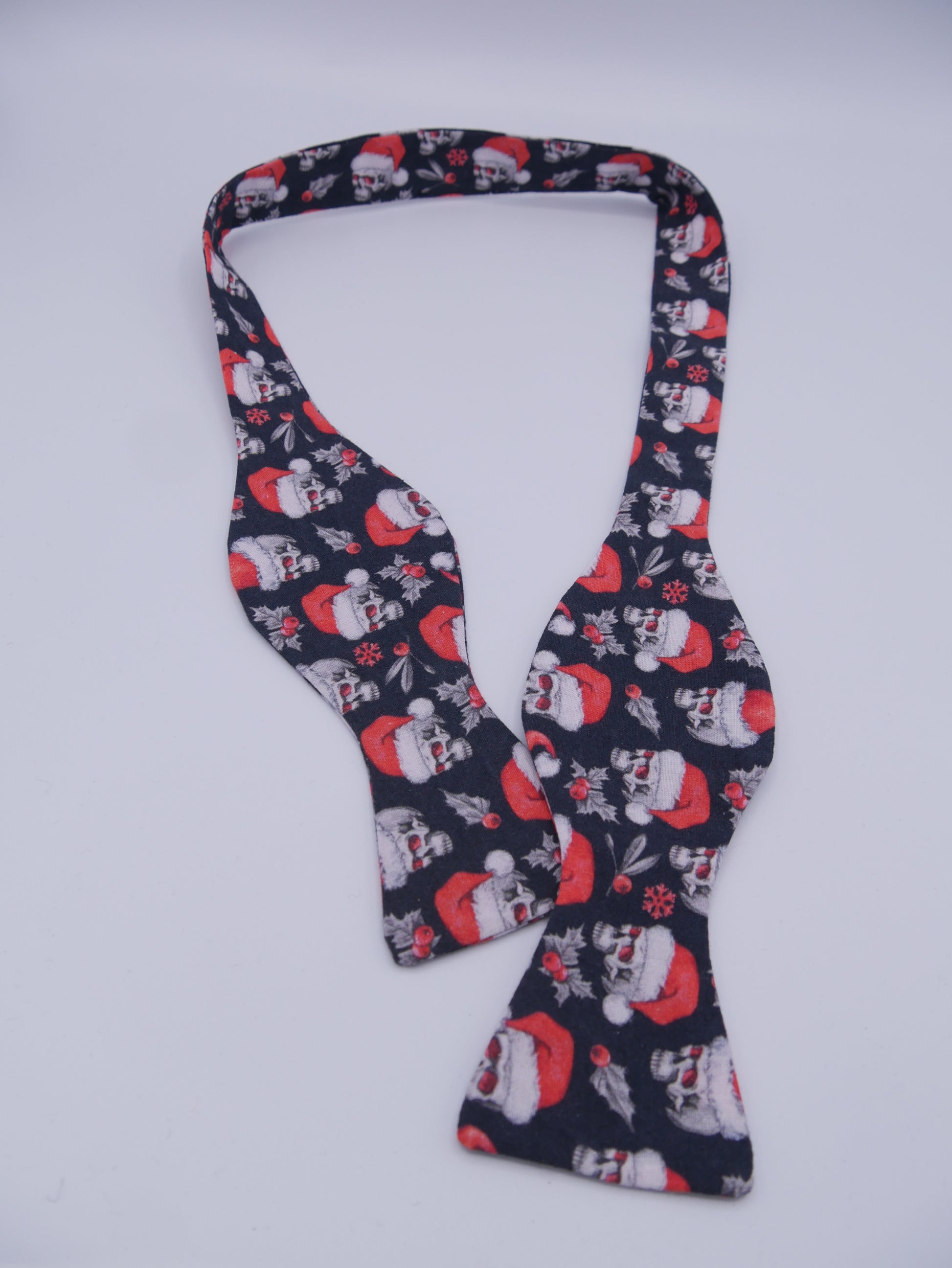 Ein Fliegen zum Binden diese hat ein Totenkopfmuster mit Weihnachtsmützen. Diese Fliege ist die perfekte Kombination aus Gothic und Weihnachten.