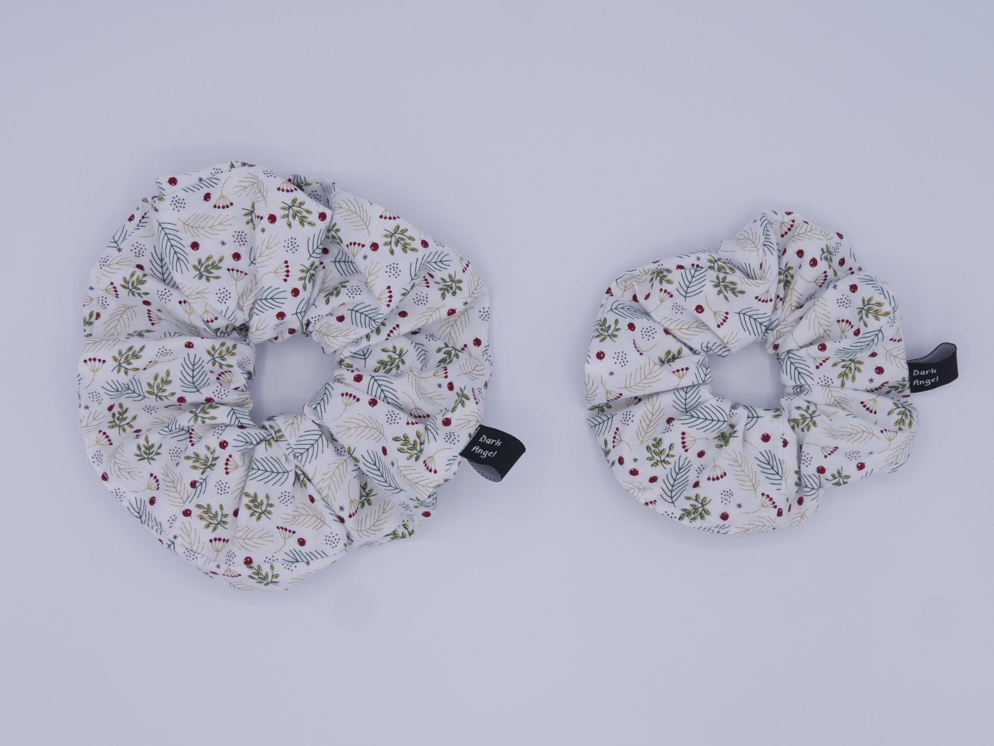 Ein Baumwolle Scrunchie das Weiß ist und ein Weihnachtsmuster hat. Die Mini Größe hat einen Durchmesser von ca. 11 cm und ist geeignet für dünnes Haar und für Kinder es passt 2 mal um Haar. Die XL Größe ist geeignet für Dünnes und Dickes Haar der Durchmesser beträgt ca. 13 cm und es passt 2 bis 3 mal ums Haar.