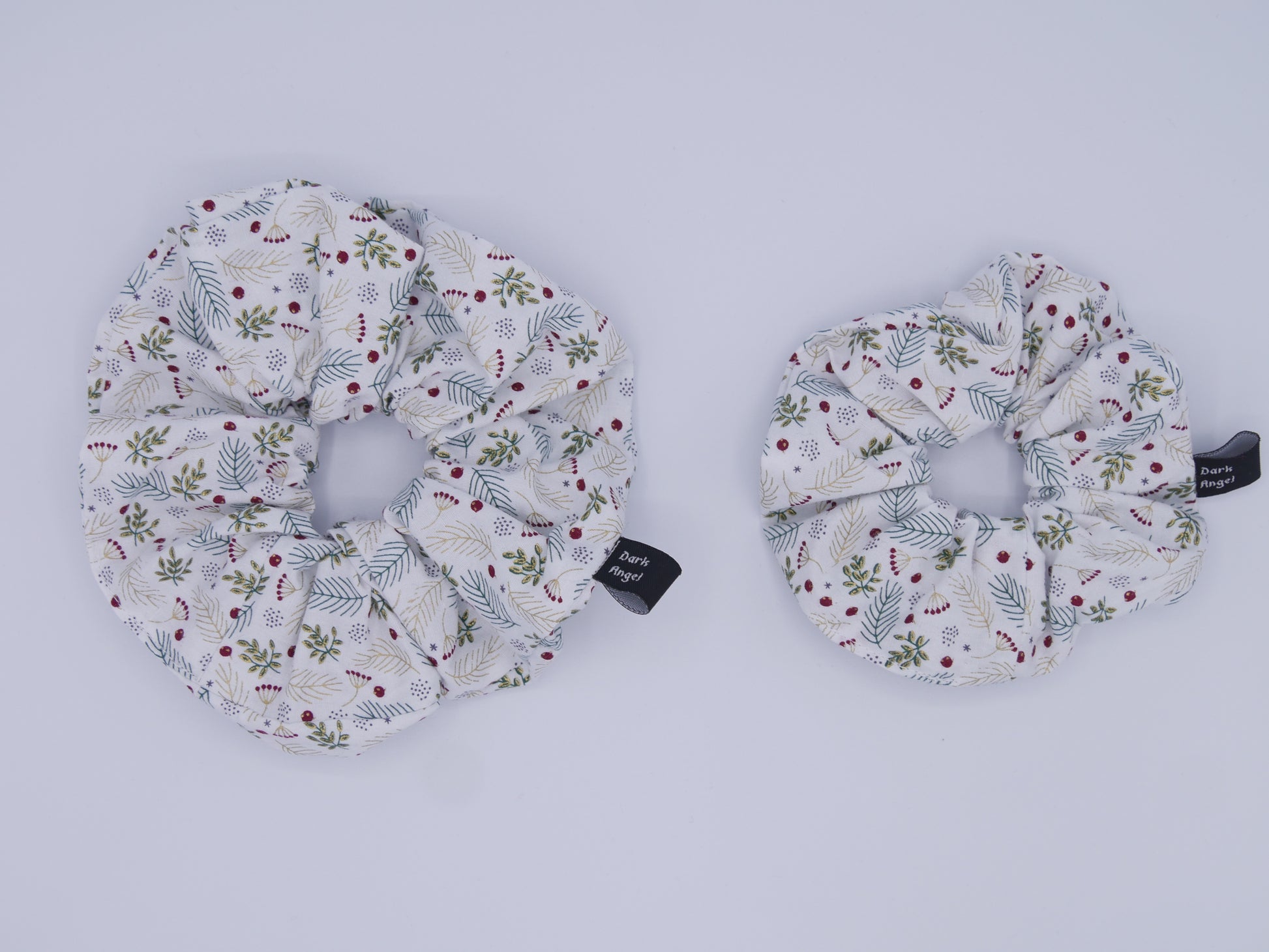 Ein Baumwolle Scrunchie das Weiß ist und ein Weihnachtsmuster hat. Die Mini Größe hat einen Durchmesser von ca. 11 cm und ist geeignet für dünnes Haar und für Kinder es passt 2 mal um Haar. Die XL Größe ist geeignet für Dünnes und Dickes Haar der Durchmesser beträgt ca. 13 cm und es passt 2 bis 3 mal ums Haar.