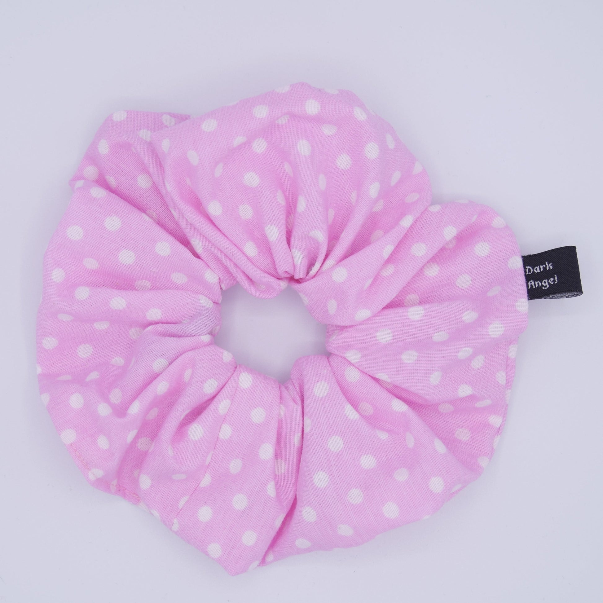 Ein Baumwoll Scrunchie das Pink ist und Weiß gepunktet ist in der Farben Pink. Die Mini Größe hat einen Durchmesser von ca. 11 cm und ist geeignet für dünnes Haar und für Kinder es passt 2 mal um Haar. Die XL Größe ist geeignet für Dünnes und Dickes Haar der Durchmesser beträgt ca. 13 cm und es passt 2 bis 3 mal ums Haar.